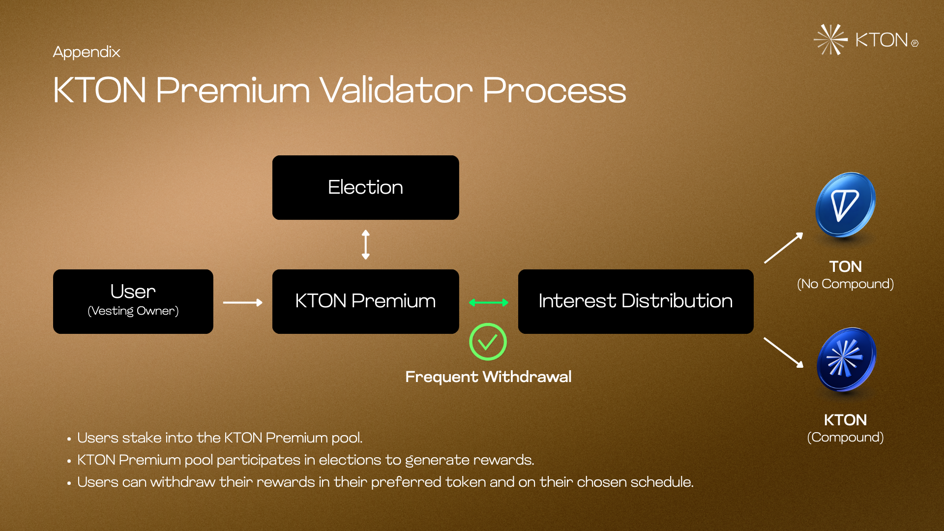 Whether you’re a TON vesting contract owner seeking flexible reward withdrawals, or a fund manager requiring enhanced yield strategies, KTON Premium is designed for your institutional needs.
