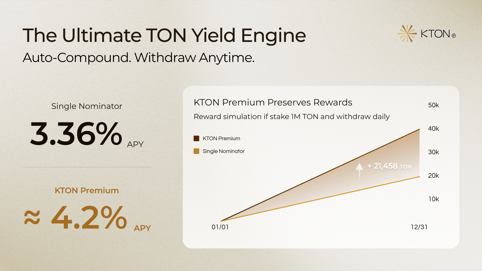 - Auto-Compound — converted into $KTON at chosen intervals for compounding