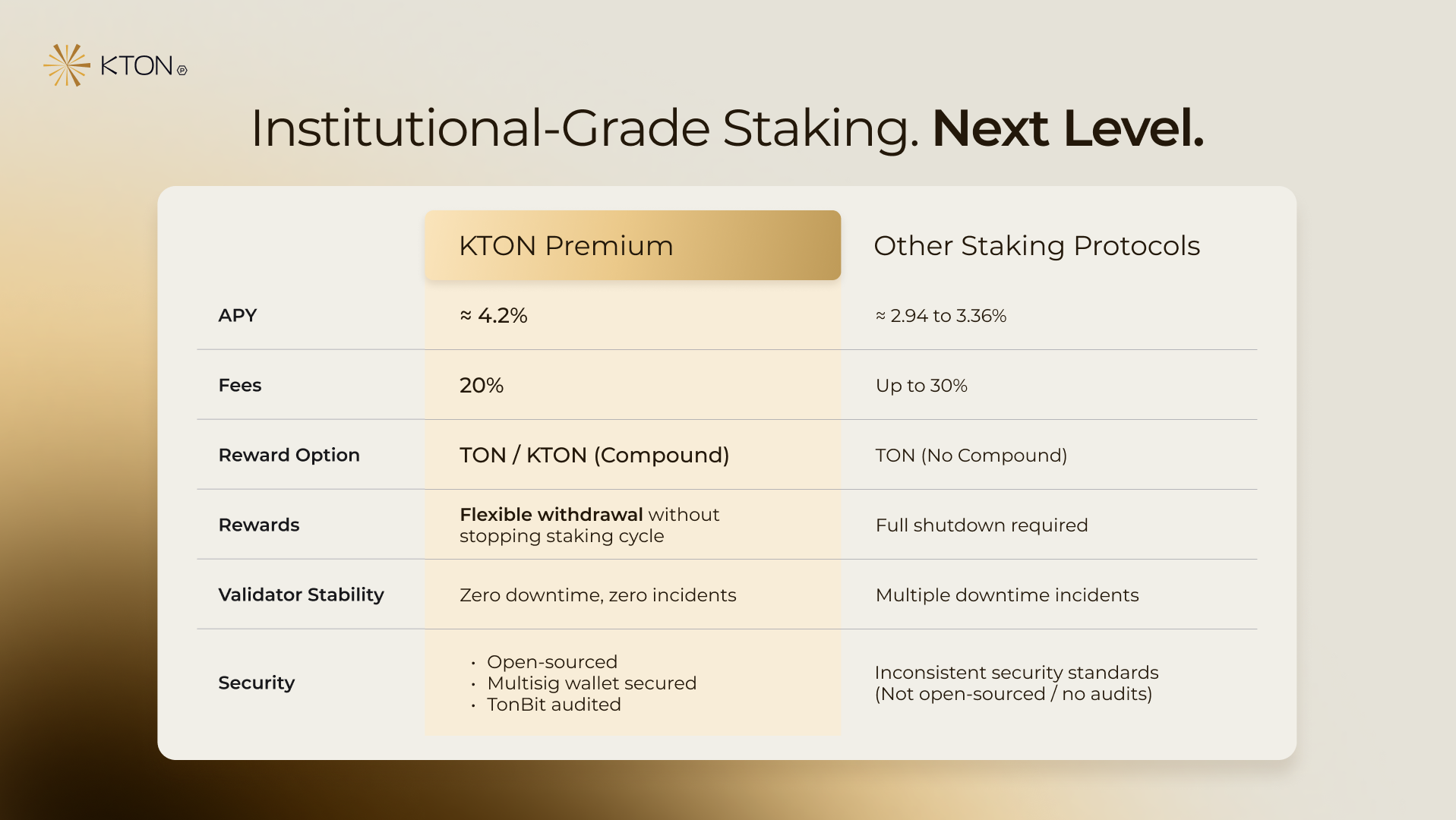 Unlike multi-chain validators, KTON is dedicated solely to TON staking infrastructure and has operated as a core validator since 2021. Leveraging our extensive validator expertise, we present KTON Premium, a tailored solution designed to meet institutional needs and overcome existing challenges.