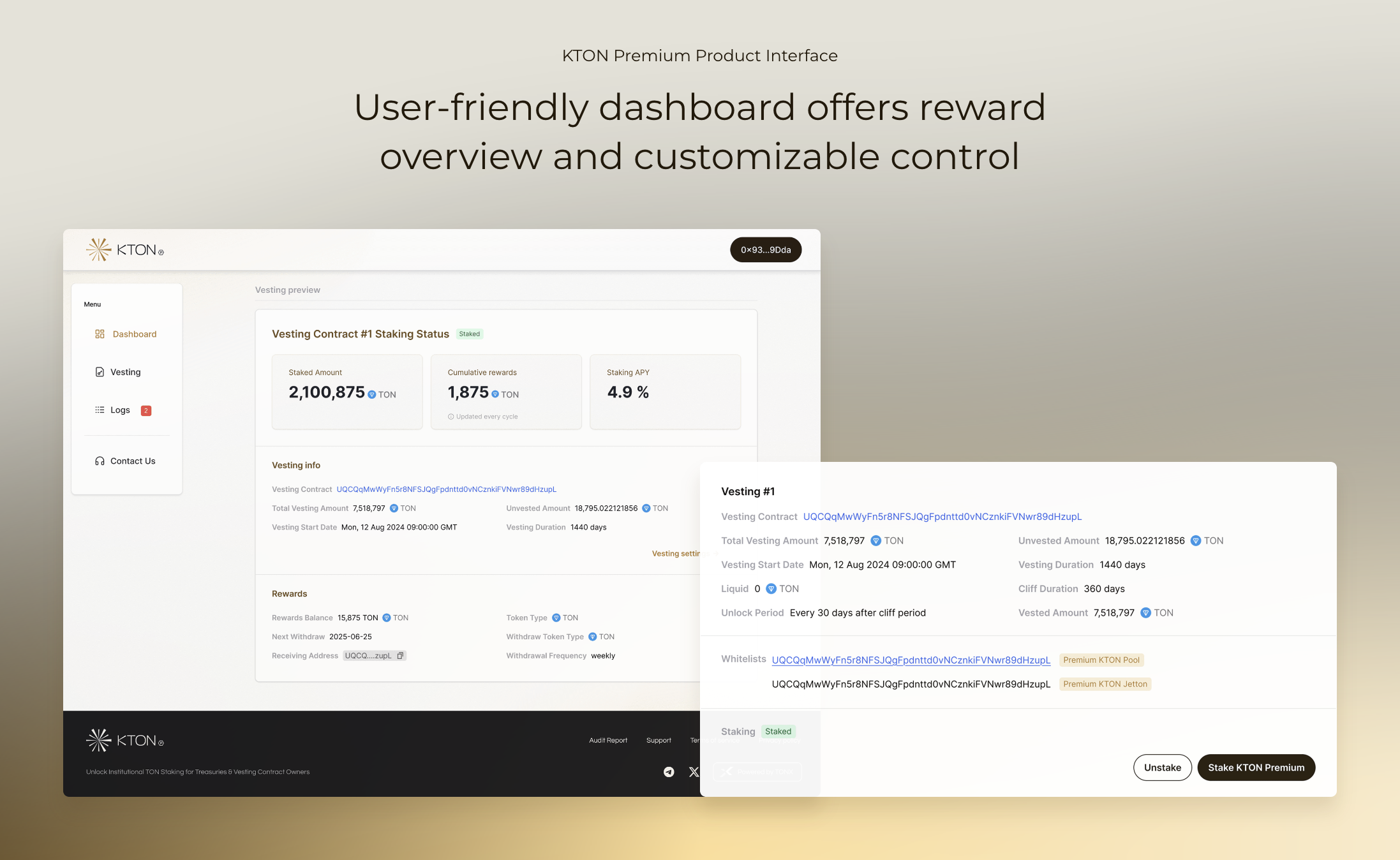- KTON Premium (premium.kton.io), our flagship product, combines security with flexible reward withdrawals and comprehensive analytics for institutional investors, funds, echanges, and TON vesting contracts.